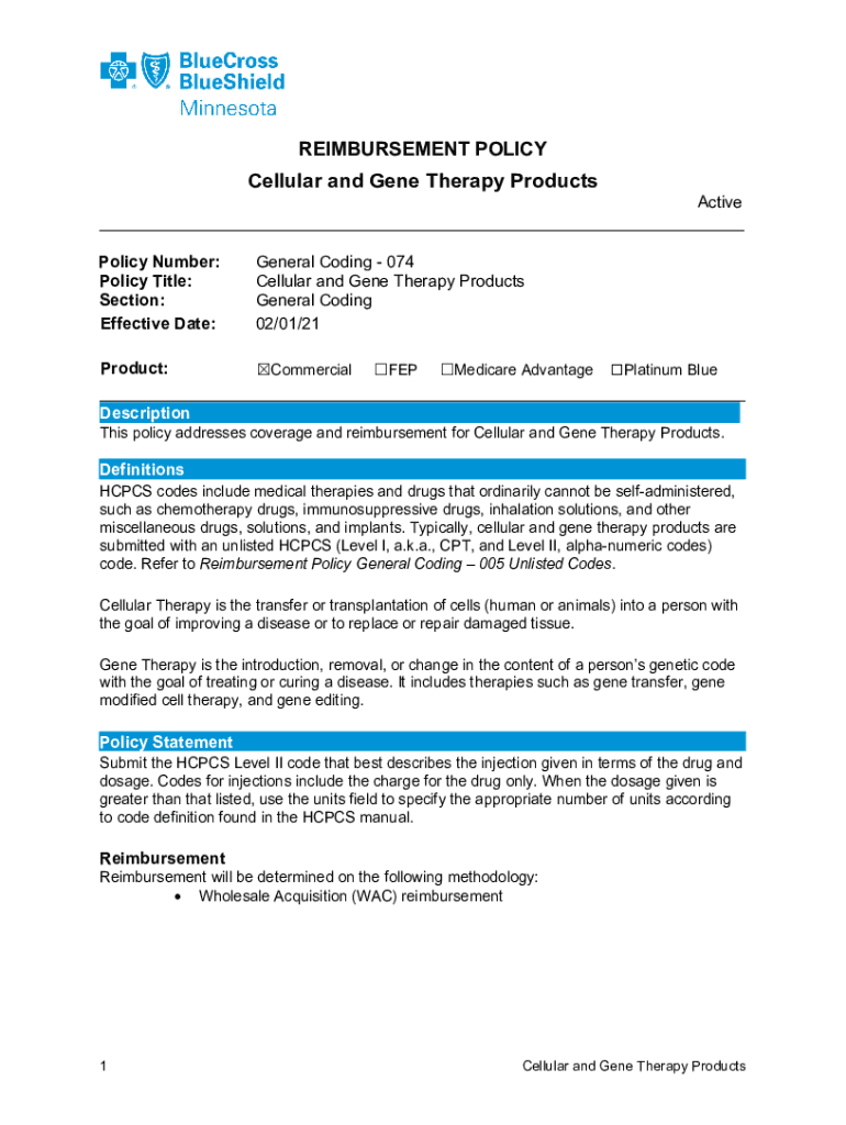 REIMBURSEMENT POLICYCellular and Gene Therapy Products Active ___ Policy Number: Policy Title: Section: Effective Date:General Coding 074 Cellular and Gene Therapy Products General Coding 02/01/21Product: