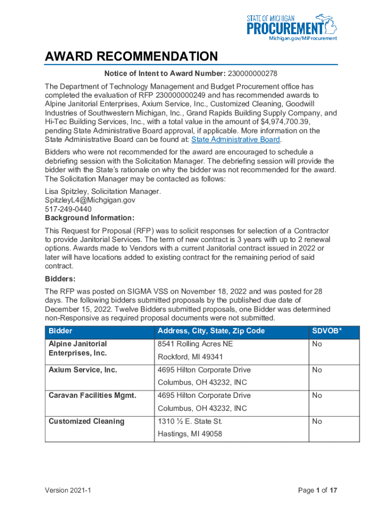 Michigan.gov/MiProcurementAWARD RECOMMENDATION Notice of Intent to Award Number: 230000000278 The Department of Technology Management and Budget Procurement office has completed the evaluation of