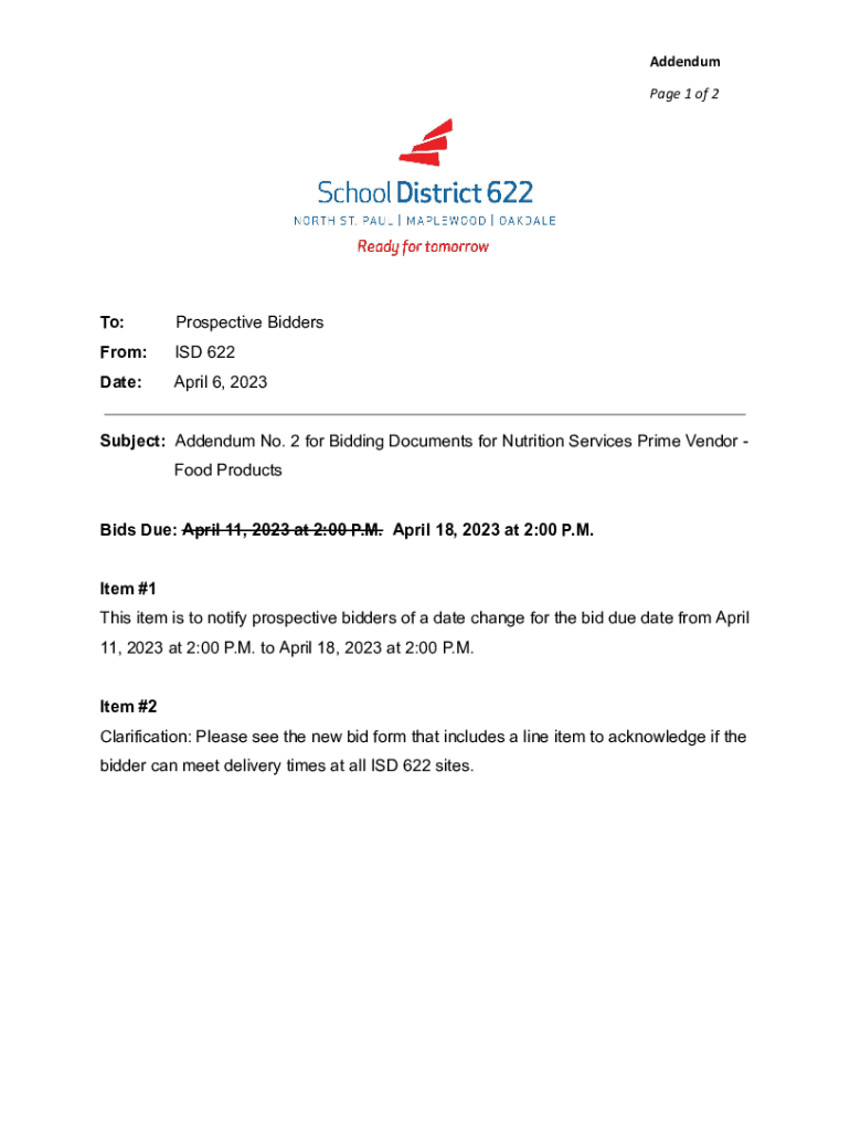 Addendum Page 1 of 2To:Prospective BiddersFrom:ISD 622Date:April 6, 2023Subject: Addendum No. 2 for Bidding Documents for Nutrition Services Prime Vendor Food Products Bids Due: April 11, 2023, at