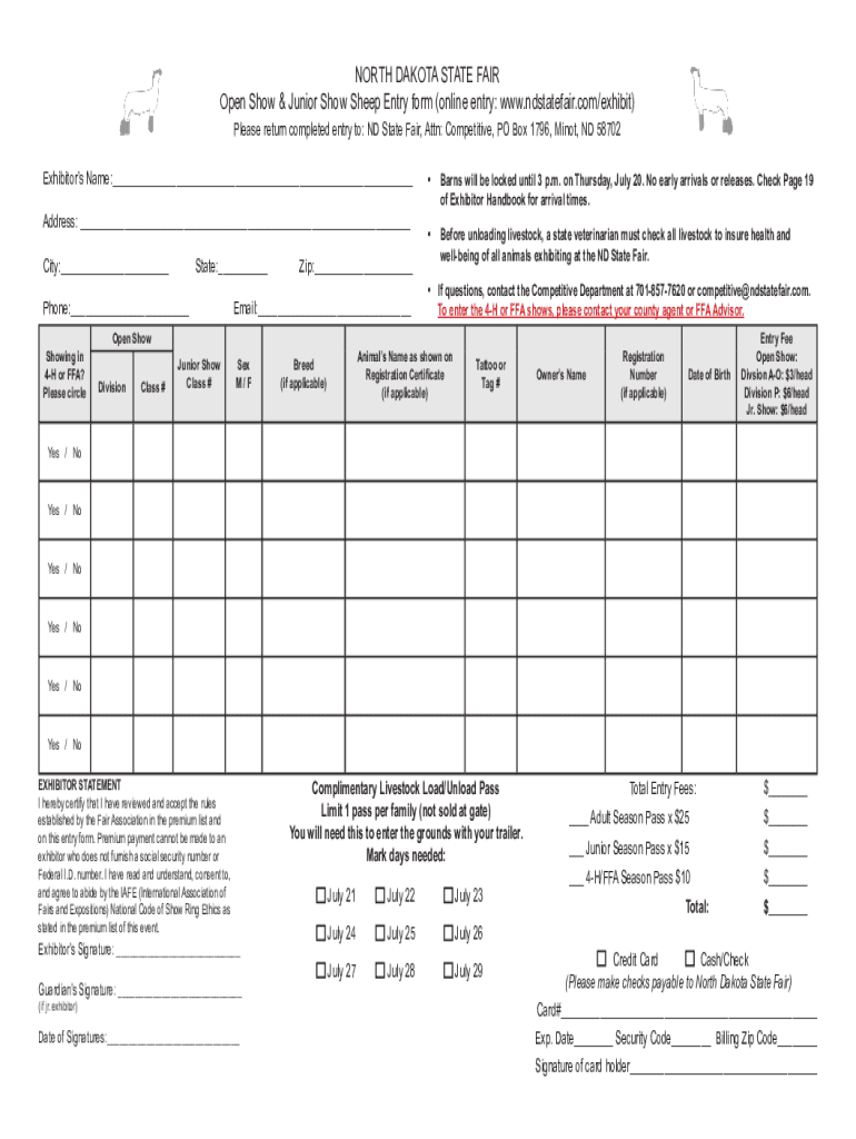 NORTH DAKOTA STATE FAIR Open Show & Junior Show Sheep Entry form (online entry: www.ndstatefair.com/exhibit) Please return completed entry to: ND State Fair, Attn: Competitive, PO Box 1796, Minot,