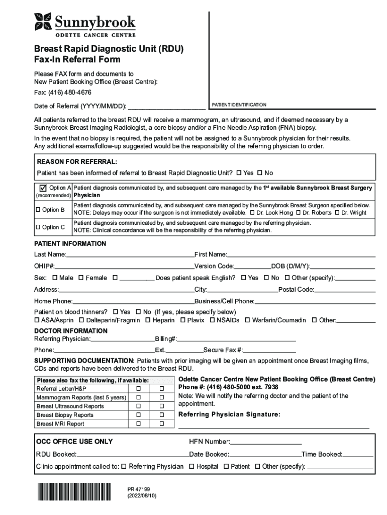 The breast rapid diagnostic unit form can be filled out online or submitted in paper format with all the necessary information and documentation.
