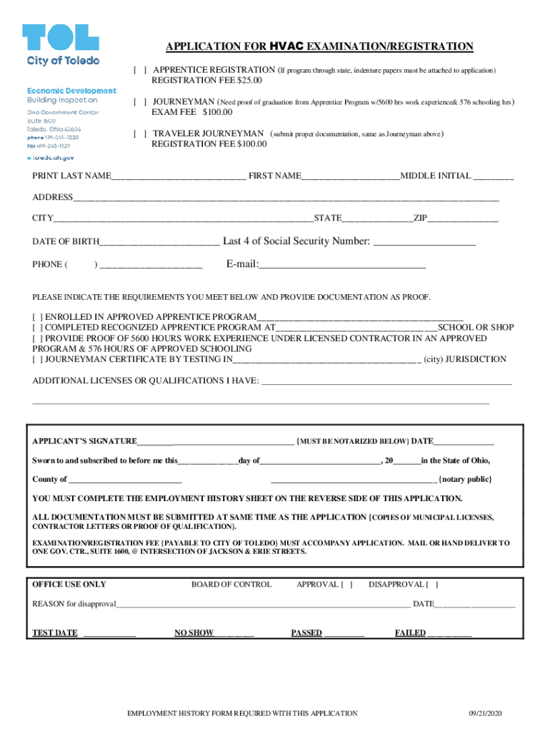 Get the free application for hvac examination/registration - CITY OF TOLEDO