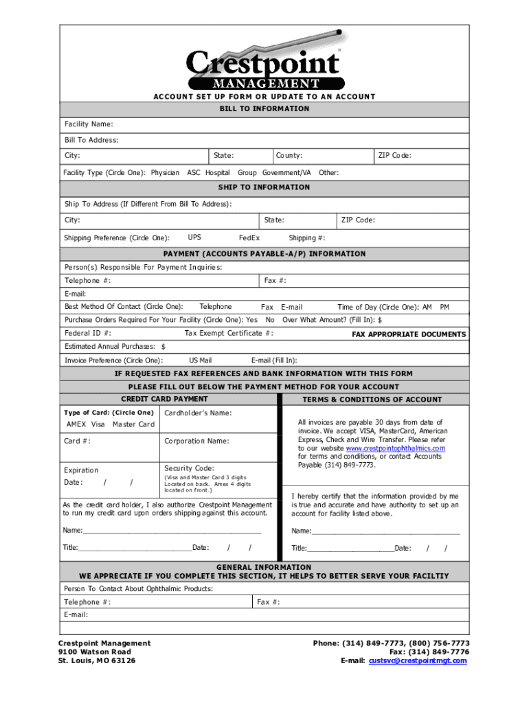 ACCOUNT SET UP FORM OR UPDATE TO AN ACCOUNT BILL TO INFORMATION Facility Name: Bill To Address: City: Facility Type (Circle One): Physician ASC Hospital ZIP Code:County:State:Group Government/Other:SHIP