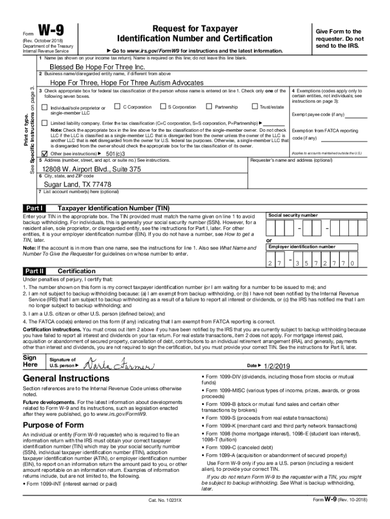 W9Form (Rev. October 2018) Department of the Treasury Internal Revenue ServiceRequest for Taxpayer Identification Number and Certification Give Form to the requester. Do not send to the IRS. Go to