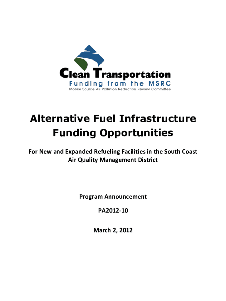 Alternative Fuel Infrastructure Funding Opportunities For New and Expanded Refueling Facilities in the South Coast Air Quality Management DistrictProgram Announcement PA201210 March 2, 2012MSRC Clean