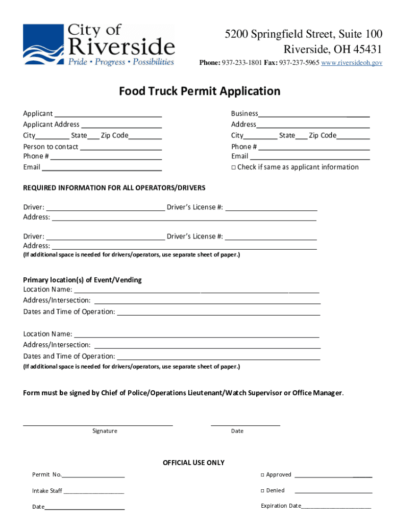 5200 Springfield Street, Suite 100 Riverside, OH 45431 Phone: 9372331801 Fax: 9372375965 www.riversideoh.govFood Truck Permit Application Applicant Address City State Person to contact Phone # EmailBusiness