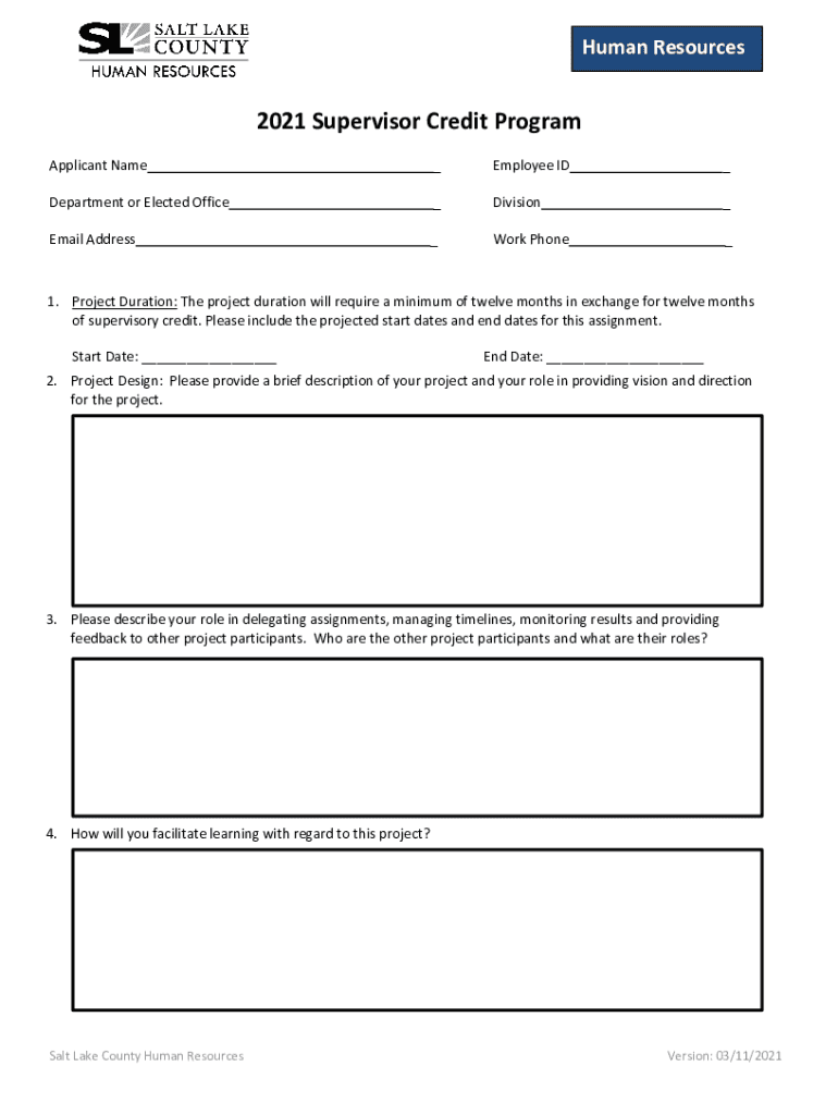 Human Resources2021 Supervisor Credit Program OverviewIntroductionTo provide career development opportunities, Salt Lake County offers employees who have never had a direct supervisory role participate