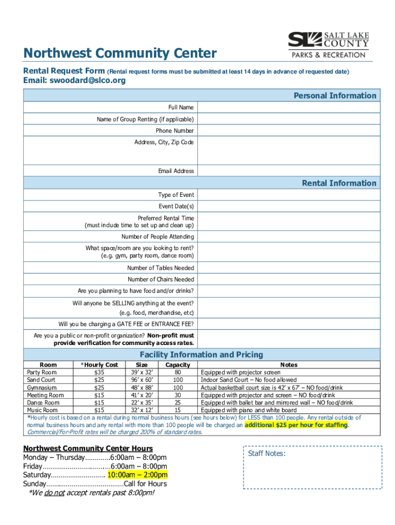 Northwest Community Center Rental Request Form (Rental request forms must be submitted at least 14 days in advance of requested date) Email: swoodard@slco.org Personal Information Full Name of Group