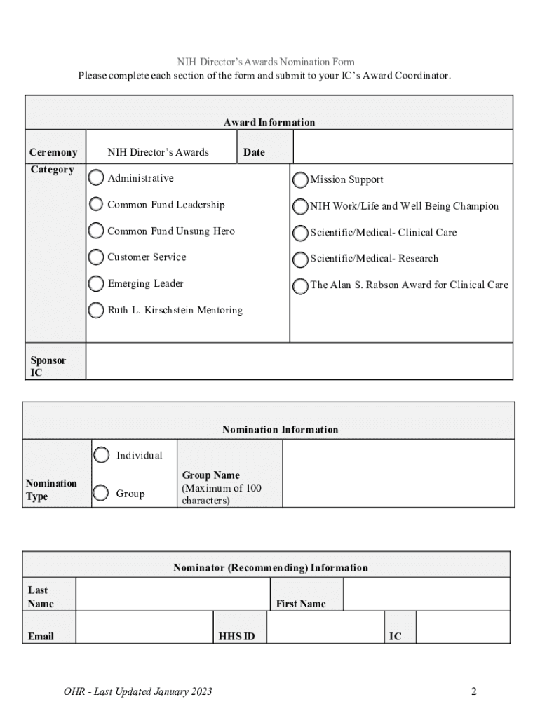 NIH Directors Awards Nomination Form Overall GuidelinesThis is the general, printable form for the NIH Directors Awards Nominations. Please complete one form per nomination and submit to your Institute/Centers