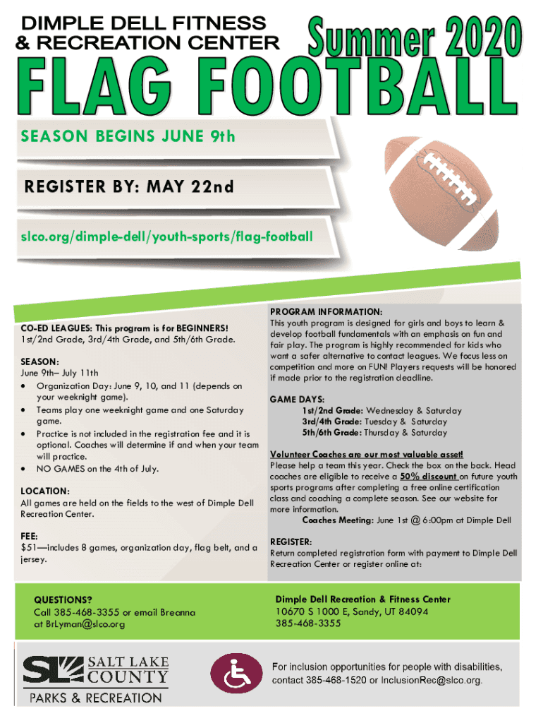 SEASON BEGINS JUNE 9thREGISTER BY: MAY 22nd slco.org/dimpledell/youthsports/flagfootballCOED LEAGUES: This program is for BEGINNERS! 1st/2nd Grade, 3rd/4th Grade, and 5th/6th Grade. SEASON: June 9th