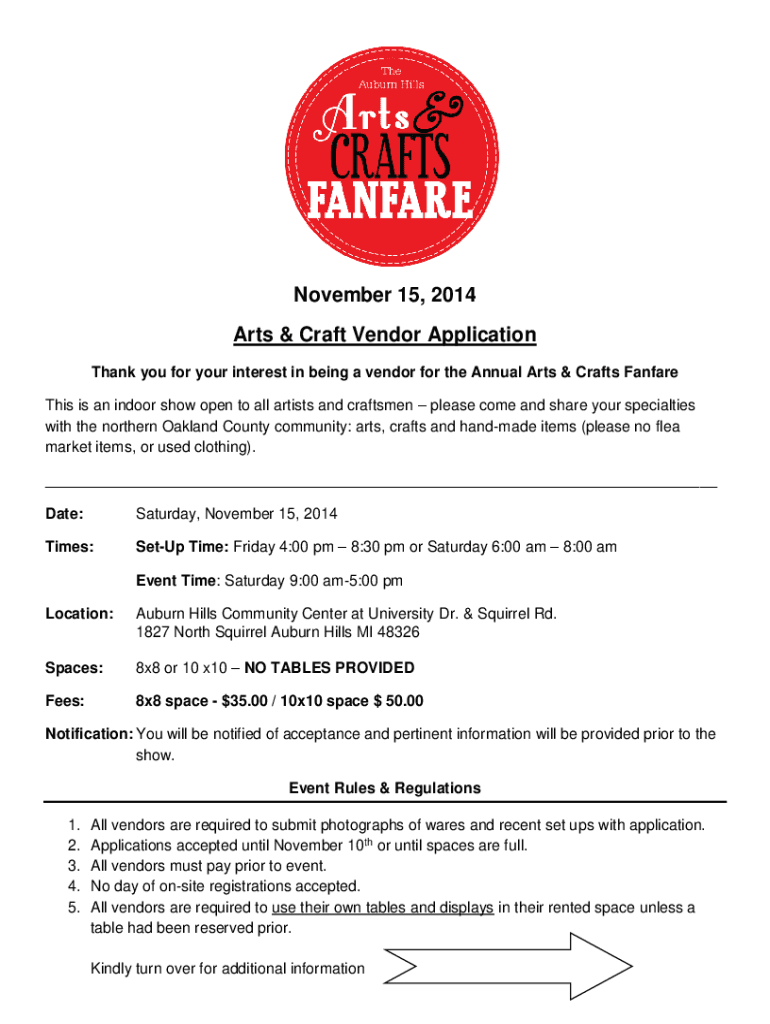 November 15, 2014, Arts & Craft Vendor Application Thank you for your interest in being a vendor for the Annual Arts & Crafts Fanfare This is an indoor show open to all artists and craftsmen please
