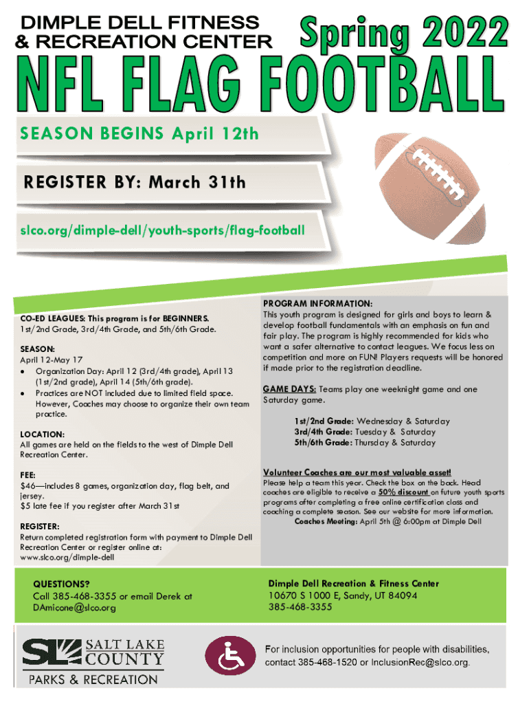 SEASON BEGINS April 12th REGISTER BY: March 31st slco.org/dimpledell/youthsports/flagfootballCOED LEAGUES: This program is for BEGINNERS. 1st/2nd Grade, 3rd/4th Grade, and 5th/6th Grade. SEASON: April