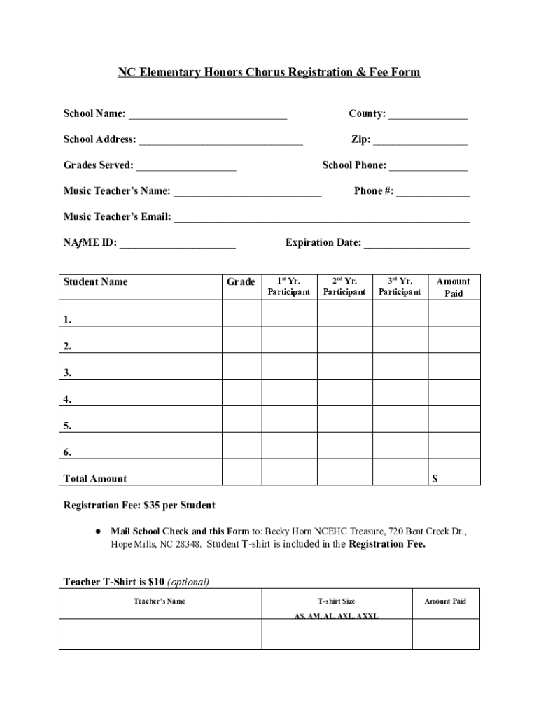 Get the free NC Elementary Honors Chorus Registration & Fee Form