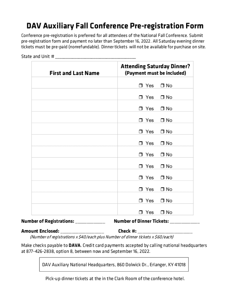DAV Auxiliary Fall Conference Preregistration Form Conference preregistration is preferred for all attendees of the National Fall Conference. Submit preregistration form and payment no later than