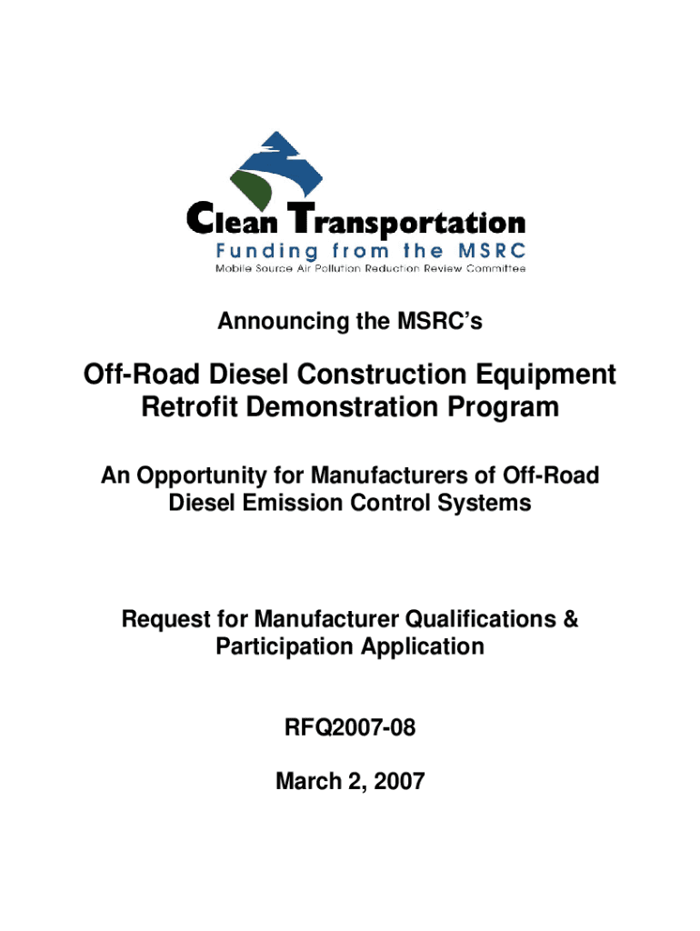Announcing the MSRCsOffRoad Diesel Construction Equipment Retrofit Demonstration Program An Opportunity for Manufacturers of Offload Diesel Emission Control SystemsRequest for Manufacturer Qualifications