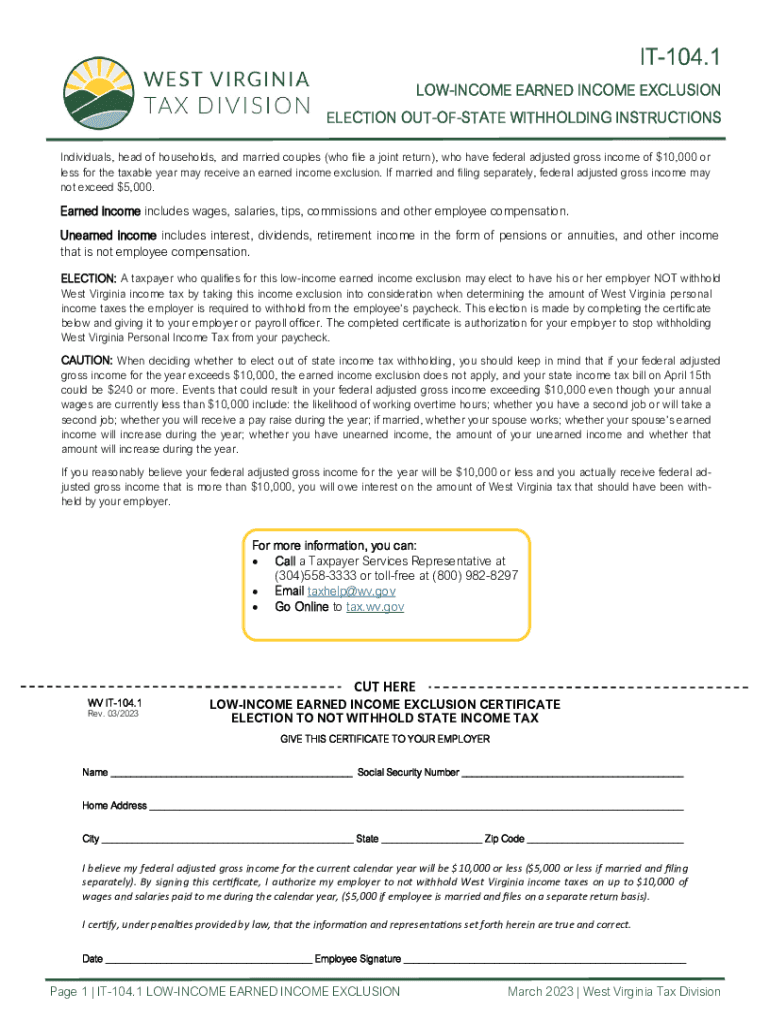 IT104.1 INCOME EARNED INCOME EXCLUSION ELECTION OUTOFSTATE WITHHOLDING INSTRUCTIONS Individuals, head of households, and married couples (who LE a joint return), who have federal adjusted gross income