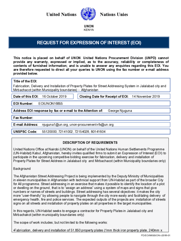 United NationsNations Units NON KENYAREQUEST FOR EXPRESSION OF INTEREST (EOI) This notice is placed on behalf of NON. United Nations Procurement Division (NPD) cannot provide any warranty, expressed