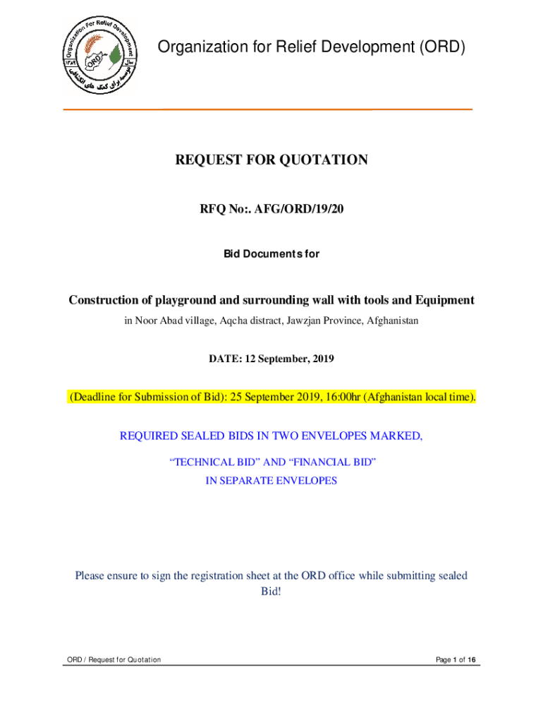 Organization for Relief Development (ORD)REQUEST FOR QUOTATION No:. AFG/ORD/19/20 Bid Documents construction of playground and surrounding wall with tools and Equipment in Noor Bad village, Alpha