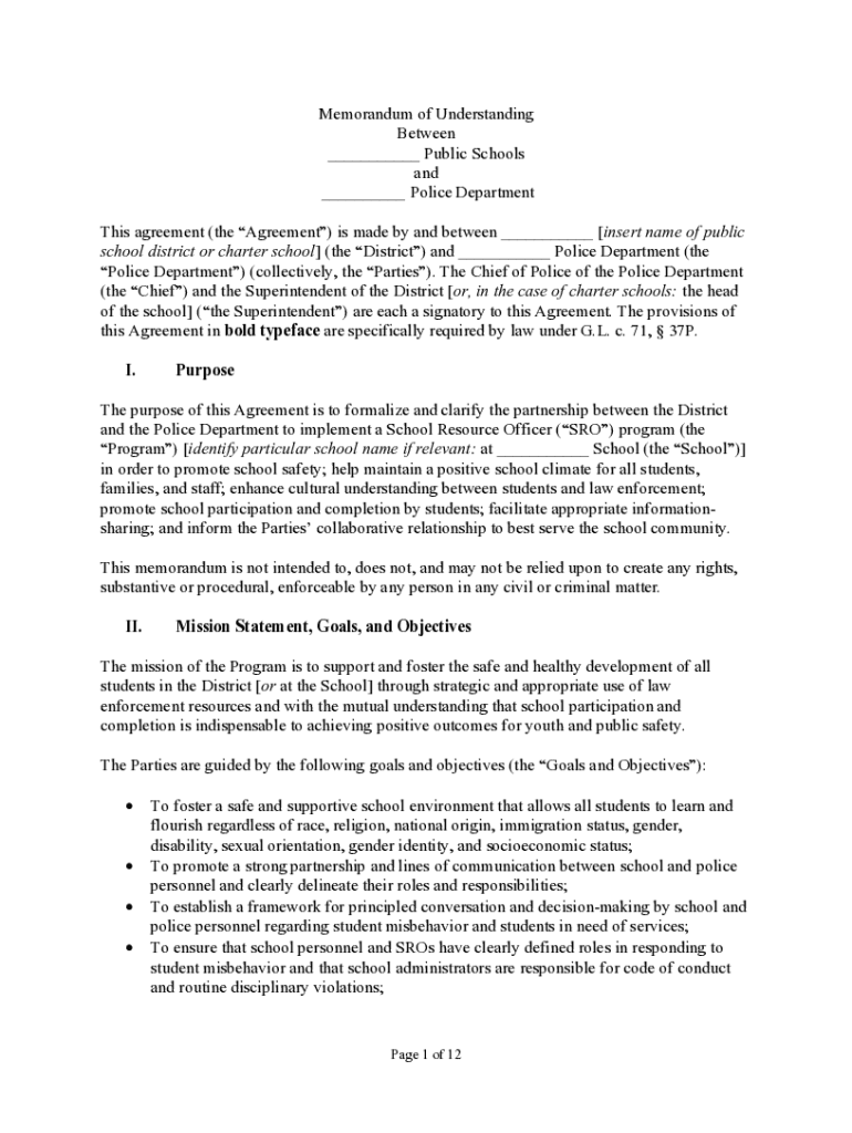 Memorandum of Understanding Between ___ Public Schools and ___ Police Department This agreement (the Agreement) is made by and between ___ [insert name of public school district or charter school]