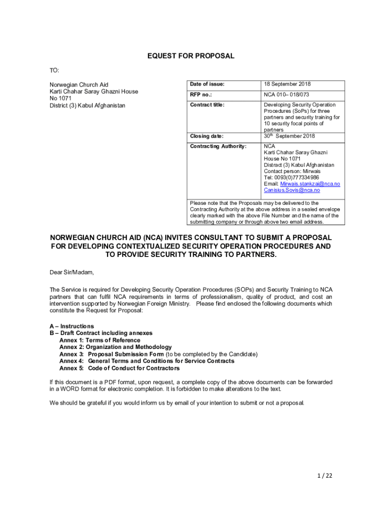 REQUEST FOR PROPOSAL TO: Norwegian Church Aid Kart Chair Sarah Ghazi House No 1071 District (3) Kabul AfghanistanDate of issue:18 September 2018RFP no.:NCA 010 018/073Contract title:Developing Security