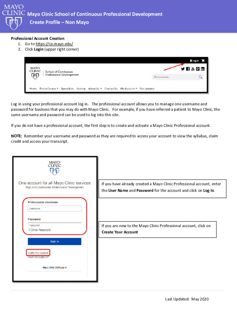 Mayo Clinic School of Continuous Professional Development Create Profile Non Mayo Professional Account Creation 1. Go to https://ce.mayo.edu/ 2. Click Login (upper right corner)Log in using your professional