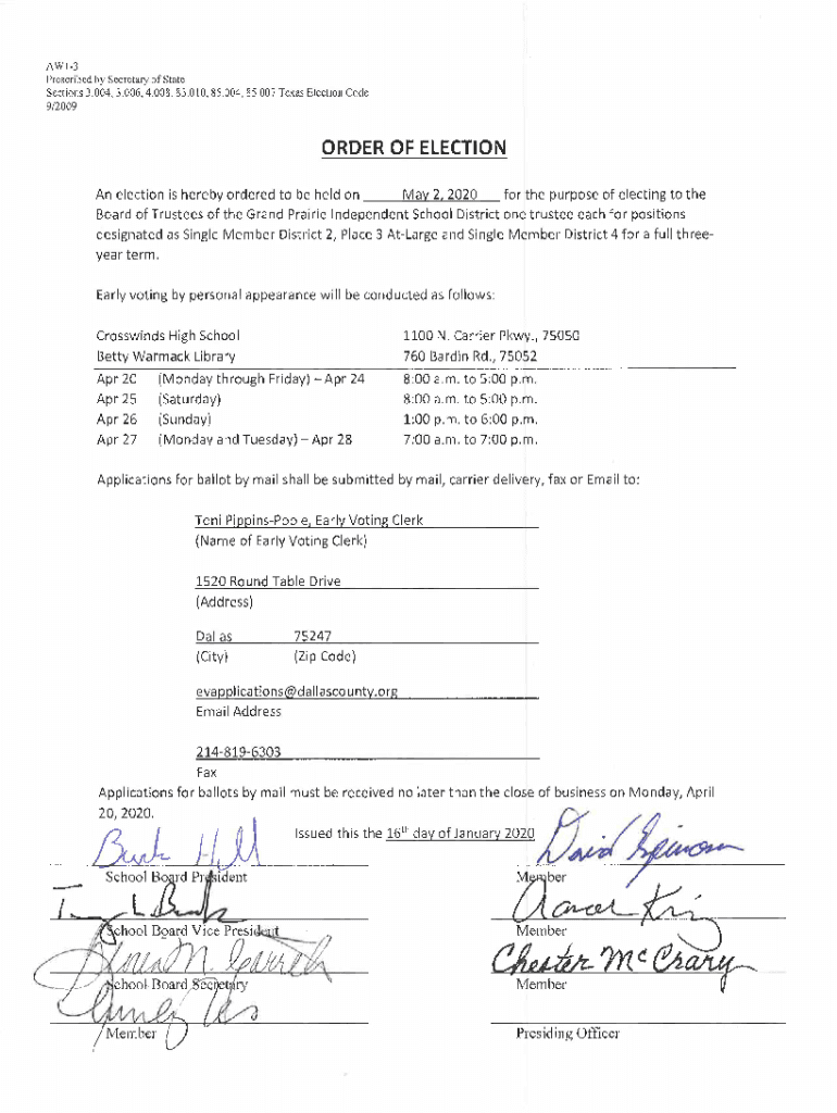 AWI3 Prescribed by Secretary of State Sections 3.004, 3.006, 4.008, 83.010, 85.004, 85.007 Texas Election Code 9/2009ORDER OF ELECTION An election is hereby ordered to be held on Naylor the 2, purpose
