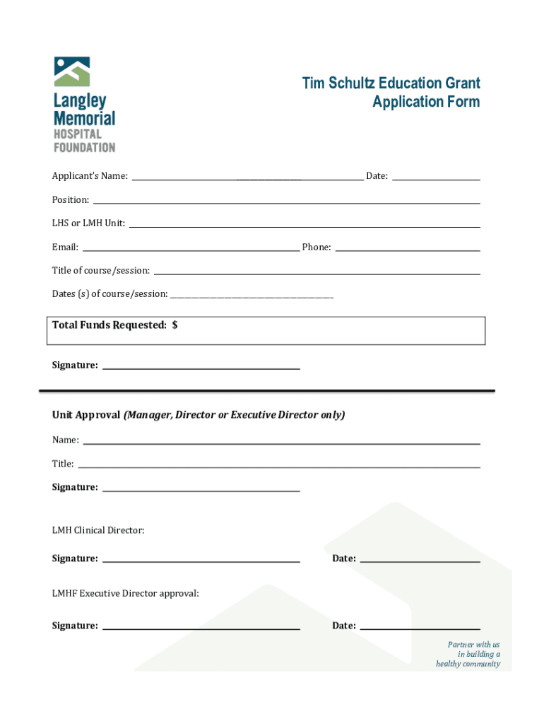 Tim Schultz Education Grant Application FormApplicants Name:___Date:Position: LHS or LMA Unit: Email:Phone:Title of course/session: Dates (s) of course/session: ___Total Funds Requested: signature:Unit