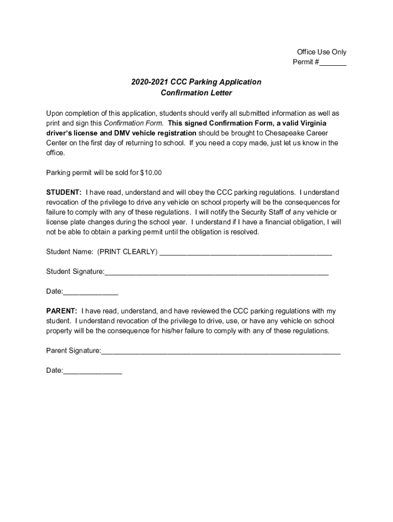 Office Use Only Permit #___20202021 CCC Parking Application Confirmation Letter Upon completion of this application, students should verify all submitted information as well as print and sign this