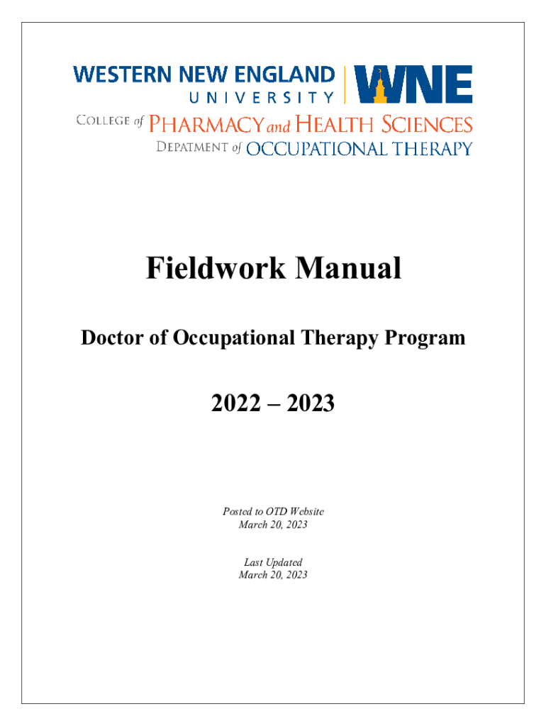 Fieldwork Manual Doctor of Occupational Therapy Program2022 2023Posted to OLD Website March 20, 2023, Last Updated March 20, 2023FIELDWORK EDUCATION POLICIES AND PROCEDURES Fieldwork Welcome .......................................................................................................................................