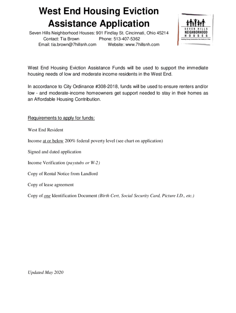 West End Housing Eviction Assistance Application Seven Hills Neighborhood Houses: 901 Findlay St. Cincinnati, Ohio 45214 Contact: Tia Brown Phone: 5134075362 Email: tia.brown@7hillsnh.com Website: