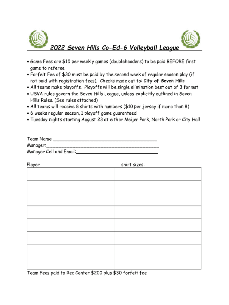 2022 Seven Hills CoEd6 Volleyball League Game Fees are $15 per weekly games (doubleheaders) to be paid BEFORE first game to referee Forfeit Fee of $30 must be paid by the second week of regular season