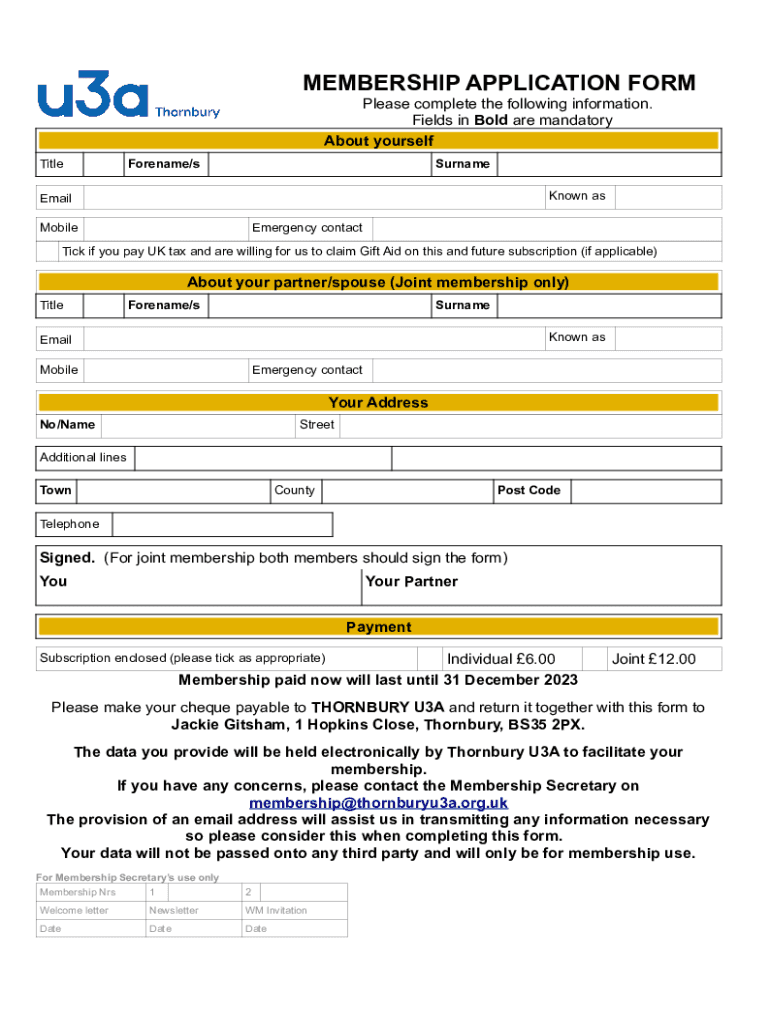 MEMBERSHIP APPLICATION FORM Please complete the following information. Fields in Bold are mandatory About yourself TitleForename/surname Known email MobileEmergency contacting if you pay UK tax and