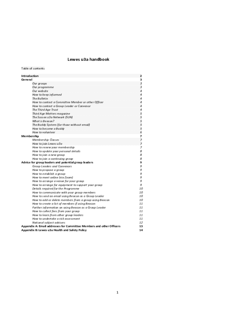 Lewis u3a handbook Table of contents Introduction General Our groups Our program Our website How to keep informed The Bulletin How to contact a Committee Member or other Officer How to contact a Group