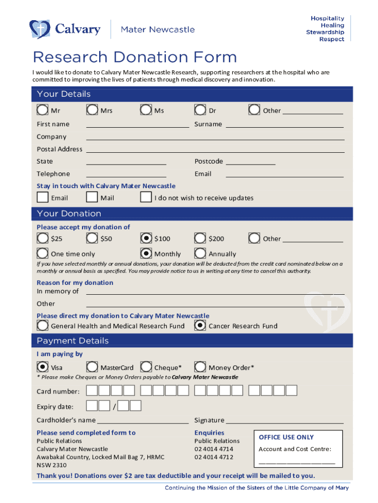 Research Donation Form I would like to donate to Calvary Mater Newcastle Research, supporting researchers at the hospital who are committed to improving the lives of patients through medical discovery