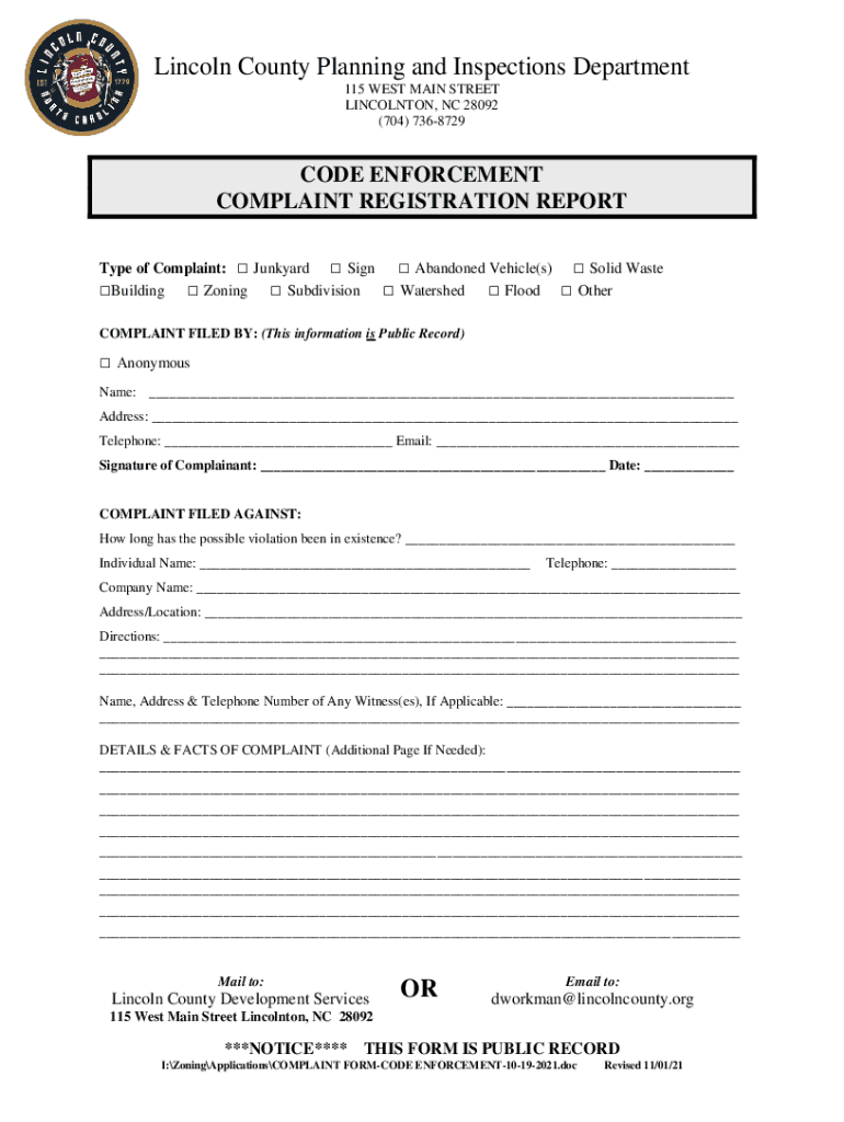 Lincoln County Planning and Inspections Department 115 WEST MAIN STREET LINCOLNTON, NC 28092 (704) 7368729CODE ENFORCEMENT COMPLAINT REGISTRATION REPORT Type of Complaint: Junkyard Sign Building Zoning