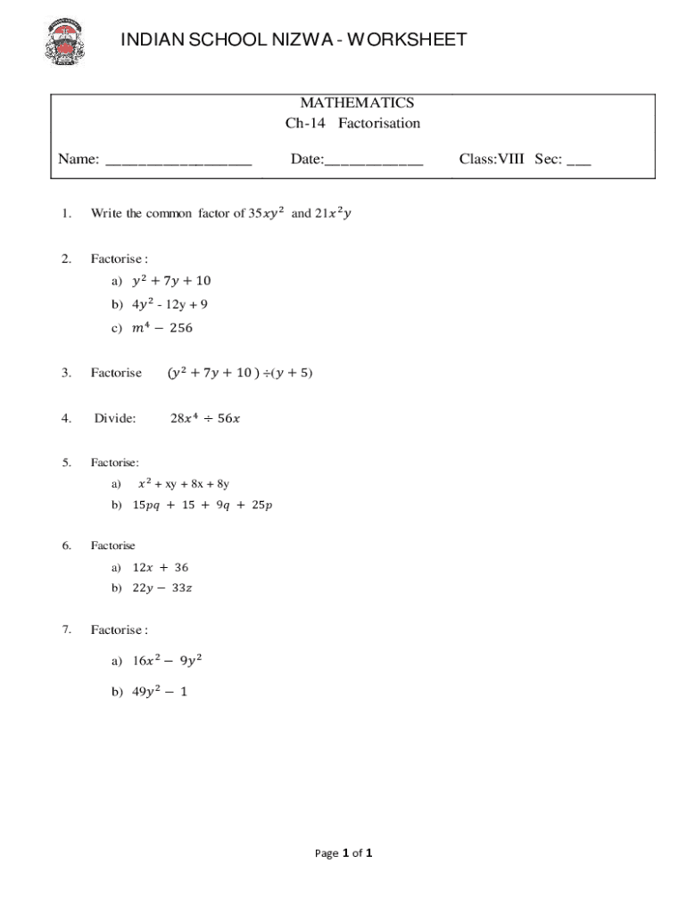 INDIAN SCHOOL IOWA WORKSHEETMATHEMATICS Ch14 Factorization Name: ___Date:___1. Write the common factor of 35 2 and 21 2 2. Factorize : a) 2 + 7 + 10 b) 4 2 12y + 9 c) 4 2563. Factorize(2 + 7 + 10)