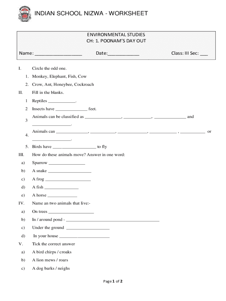 INDIAN SCHOOL IOWA WORKSHEETENVIRONMENTAL STUDIES CH: 1. POONA DAY OUT Name: ___ I. Date:___Class: III Sec: ___Circle the odd one. 1. Monkey, Elephant, Fish, Cow 2. Crow, Ant, Honeybee, Cockroaches.