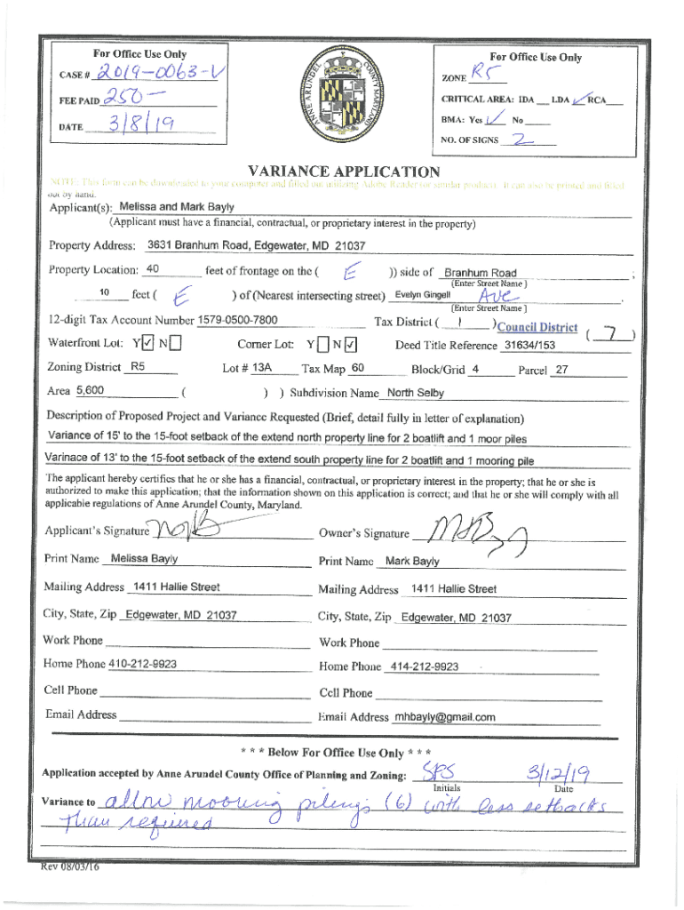 For Officers Only Office UseOnlyCASES SL(i00(DONE /free PAIDCRITICALAREA: IDA_LAURA_sisiiciDATEBMA: Yes L/Non.DESIGNS\'2VARIANCE APPLICATION OA in(IAU. Applicant(s): Melissa and Mark Badly (Applicant