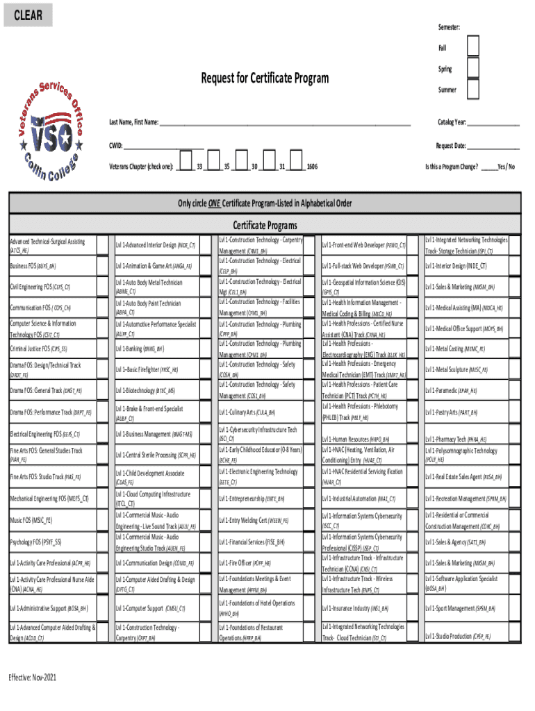 CLEARSemester: FallRequest for Certificate Program Last Name, First Name: ___ CID: ___Spring Summer Catalog Year: ___ Request Date: ___Veterans Chapter (check one): ___ 33 ___ 35 ___ 30 ___ 31 ___