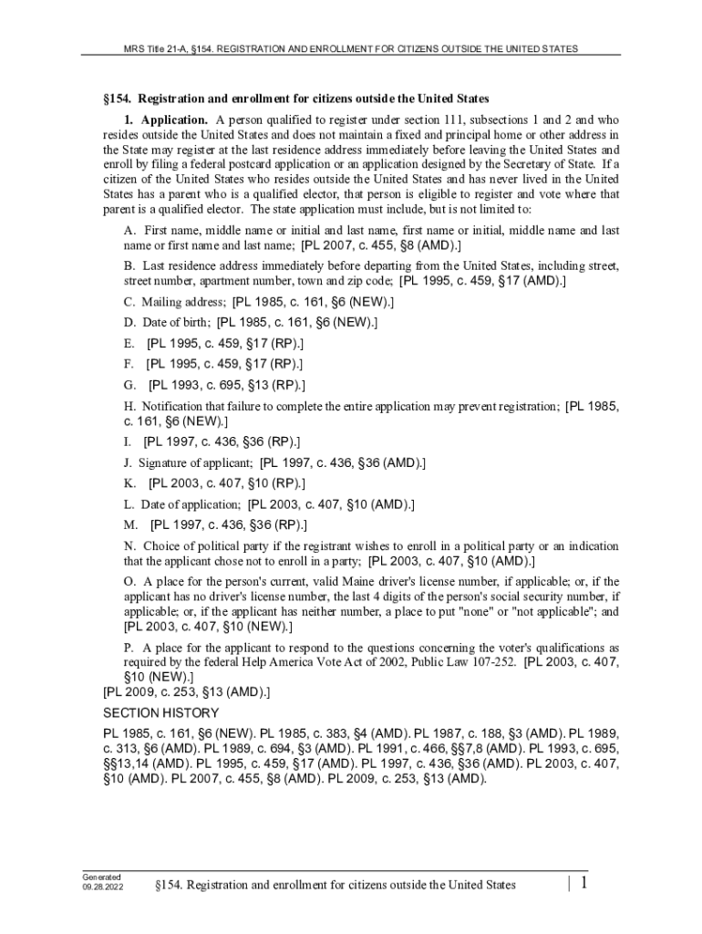 MRS Title 21A, 154. REGISTRATION AND ENROLLMENT FOR CITIZENS OUTSIDE THE UNITED STATES154. Registration and enrollment for citizens outside the United States 1. Application. A person qualified to