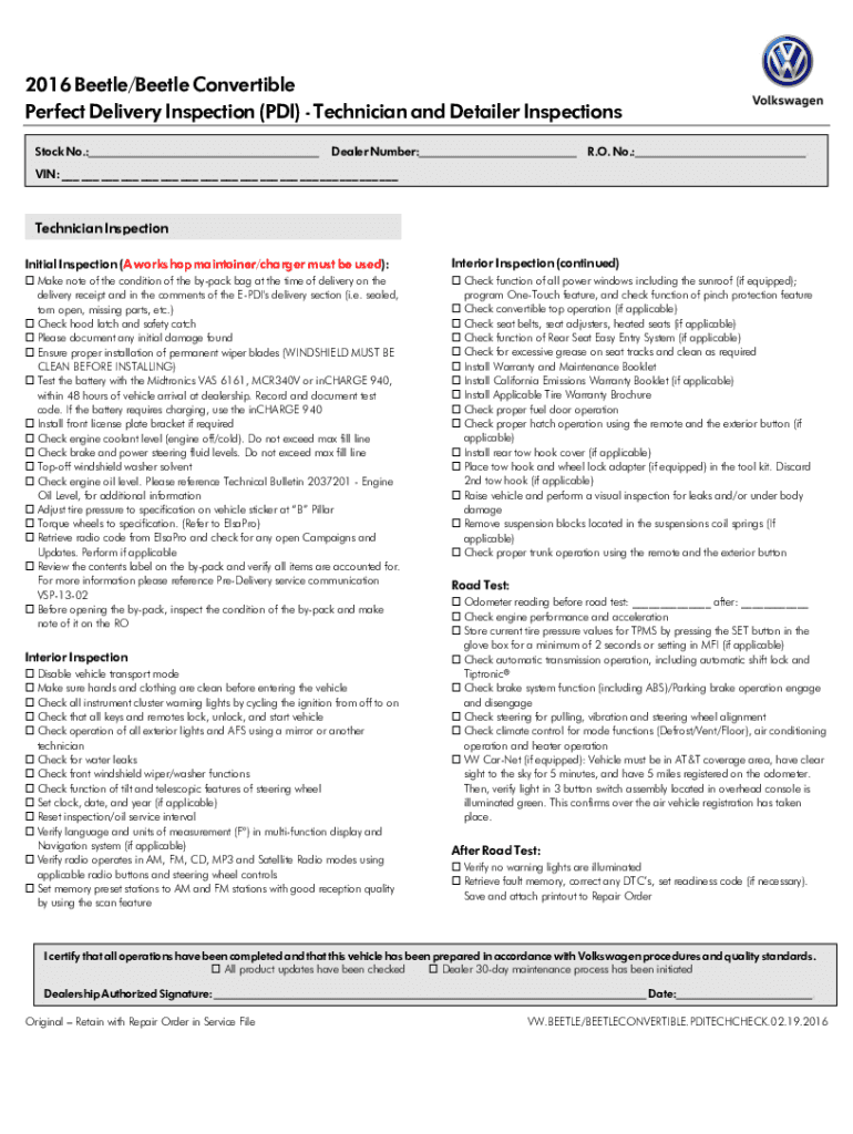 2016 Beetle/Beetle Convertible Perfect Delivery Inspection (PDI) Technician and Detailer Inspections Stock No.:Dealer Number:R.O. No.:.VIN: ___ ___ ___ ___ ___ ___ ___ ___ ___ ___ ___ ___ ___ ___