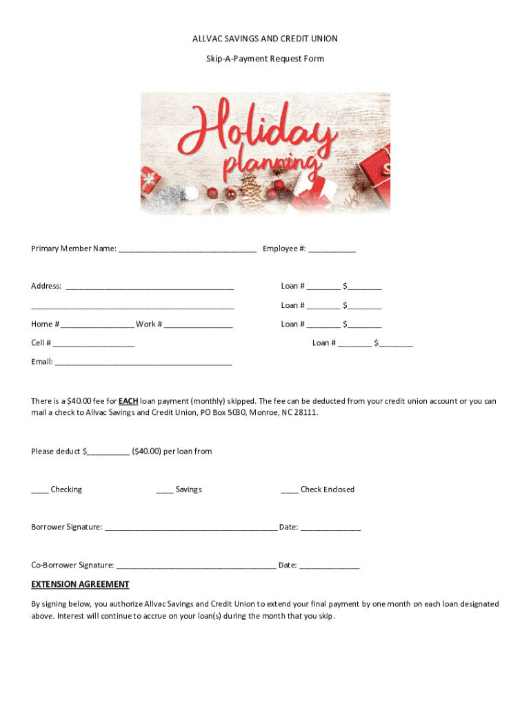 ALL VAC SAVINGS AND CREDIT UNION SkipAPayment Request Preprimary Member Name: ___ Employee #: ___Address: ___Loan # ___ $______Loan # ___ $___Home # ___ Work # ___Loan # ___ $___Cell # ___Loan # ___