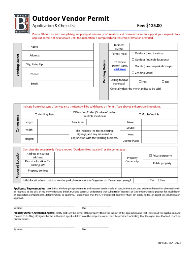 Outdoor Vendor Permit Application & Checklist: $125.00Please fill out this form completely, supplying all necessary information and documentation to support your request. Your application will not