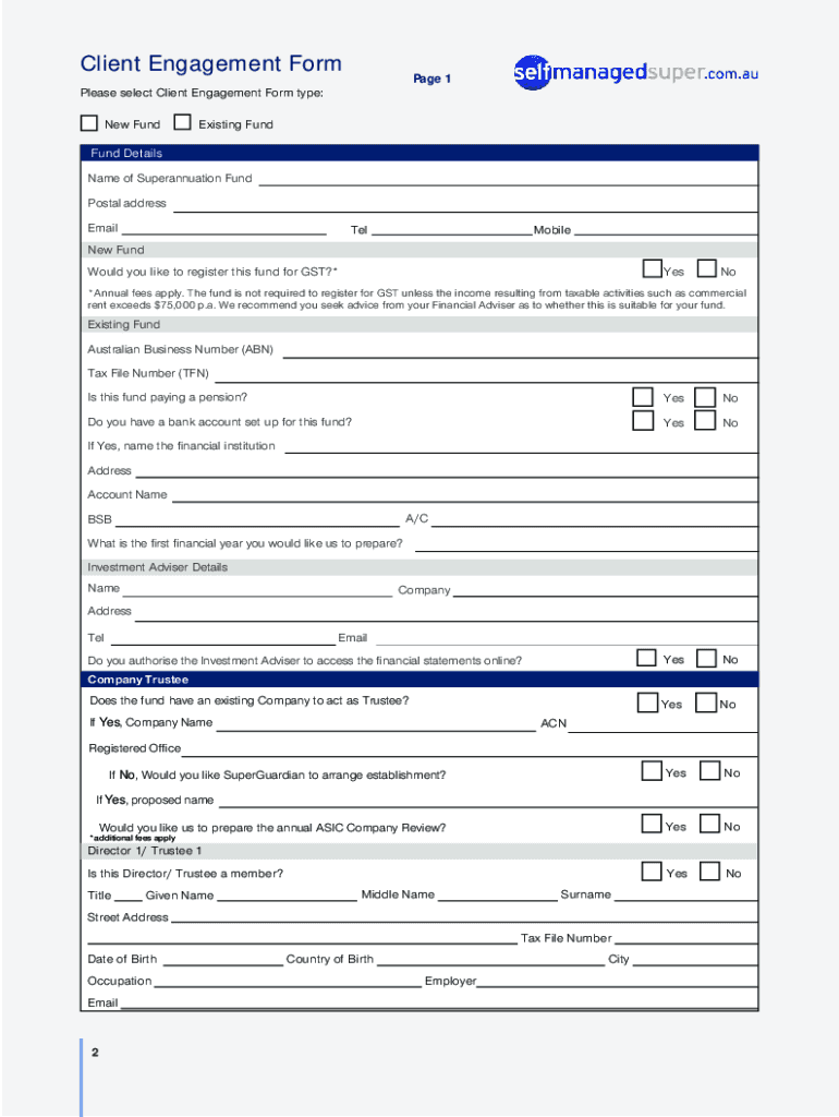 Client Engagement Form1Client Engagement Form Page 1Please select Client Engagement Form type: New Fundraising Funding Details Name of Superannuation Fund Postal address EmailTelMobileNew Fund Would