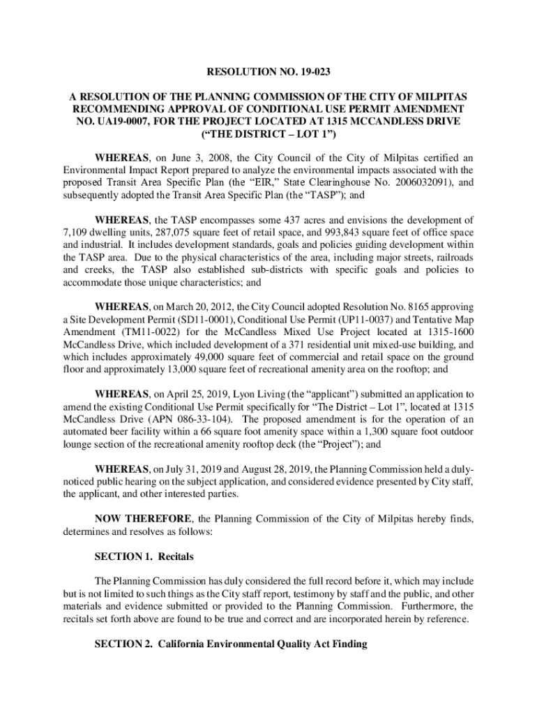 RESOLUTION NO. 19023 A RESOLUTION OF THE PLANNING COMMISSION OF THE CITY OF MILPITAS RECOMMENDING APPROVAL OF CONDITIONAL USE PERMIT AMENDMENT NO. UA190007, FOR THE PROJECT LOCATED AT 1315 McCandless