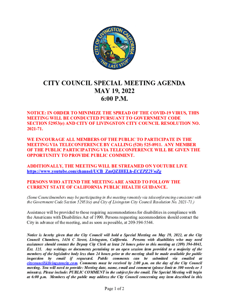CITY COUNCIL SPECIAL MEETING AGENDA MAY 19, 2022 6:00 P.M. NOTICE: IN ORDER TO MINIMIZE THE SPREAD OF THE COVID-19 VIRUS, THIS MEETING WILL BE CONDUCTED PURSUANT TO GOVERNMENT CODE SECTION 52953(e)