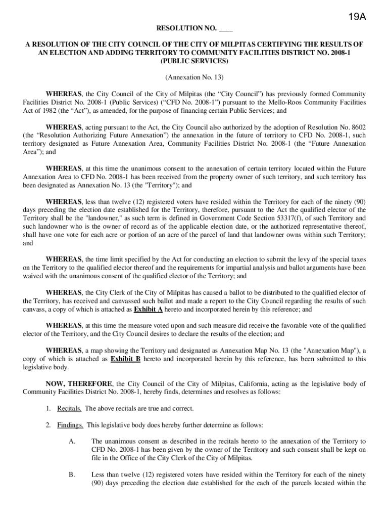 19A RESOLUTION NO. ___ A RESOLUTION OF THE CITY COUNCIL OF THE CITY OF MILPITAS CERTIFYING THE RESULTS OF AN ELECTION AND ADDING TERRITORY TO COMMUNITY FACILITIES DISTRICT NO. 20081 (PUBLIC SERVICES)
