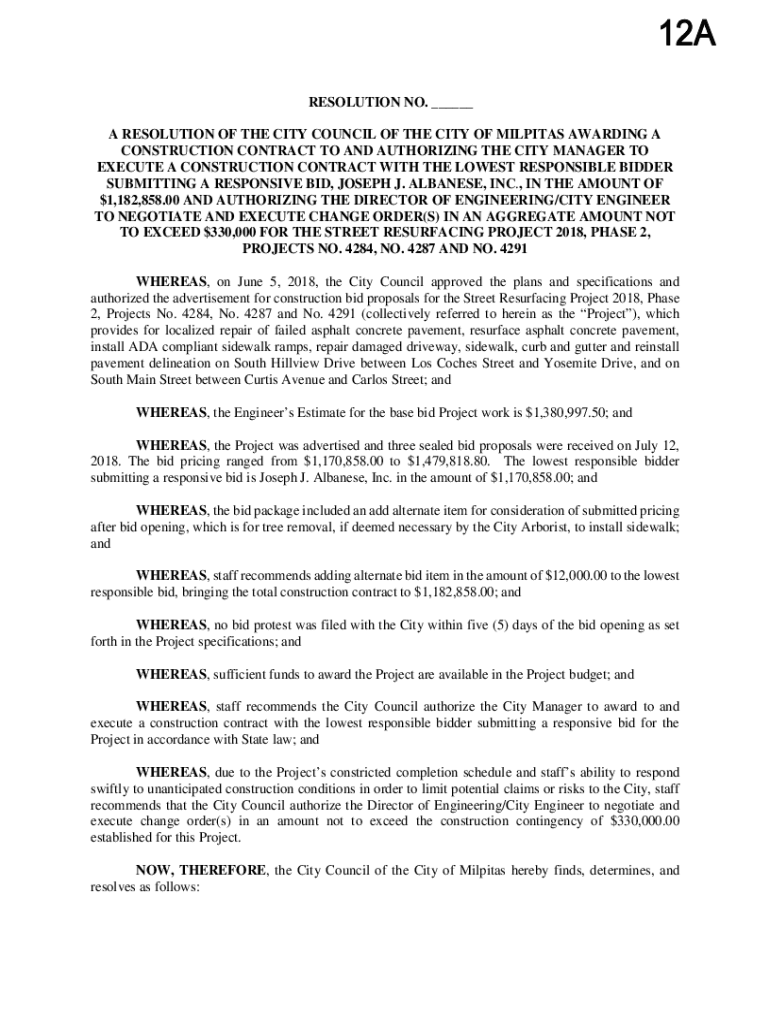 12A RESOLUTION NO. ___ A RESOLUTION OF THE CITY COUNCIL OF THE CITY OF MILPITAS AWARDING A CONSTRUCTION CONTRACT TO AND AUTHORIZING THE CITY MANAGER TO EXECUTE A CONSTRUCTION CONTRACT WITH THE LOWEST