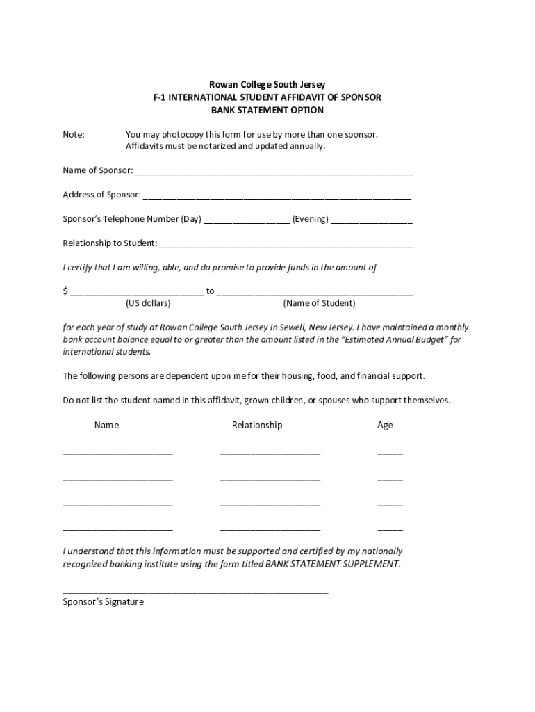 Rowan College South Jersey F1 INTERNATIONAL STUDENT AFFIDAVIT OF SPONSOR BANK STATEMENT OPTION Note:You may photocopy this form for use by more than one sponsor. Affidavits must be notarized and updated