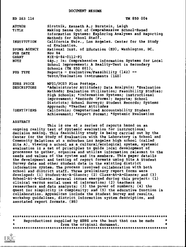 DOCUMENT RESUME ED 263 114AUTHOR TITLE INSTITUTIONSPONS AGENCY PUB DATE GRANT NOTE PUB TYPERS PRICE DESCRIPTORSIDENTIFIERSTM 850 004 Ironic, Kenneth A.; Burstein, Leigh Making Sense Out of Comprehensive